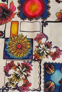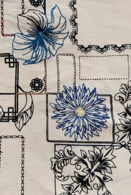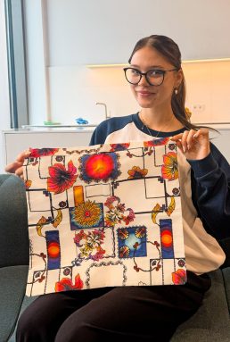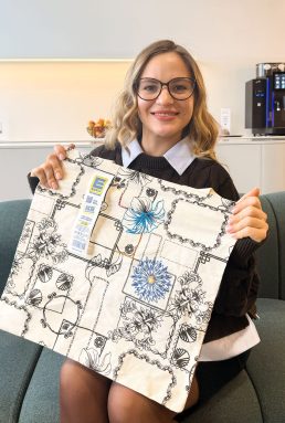 Anhelina Dovhopolova, Auszubildende Property & Facility Management, Geschäftsbereich Immobilien bei EDEKA Südwest, kommt aus der Ukraine und lebt seit vier Jahren in Deutschland. „In meiner Heimat wird das Stickhandwerk sehr geschätzt – das habe ich dort schon als Kind gelernt“, erzählt sie. Anhelina beherrscht auch aufwendigere Techniken wie Perlenstickerei. Für ihre Manomama-Tasche hat sie sich aber bewusst für eine einfachere Variante entschieden und die Umrisse einzelner Blüten des aufgedruckten Musters mit blauem und gelbem Garn nachgestickt. „Ich werde weitermachen, aber schon jetzt hat niemand dieselbe Tasche wie ich,“ freut sie sich.