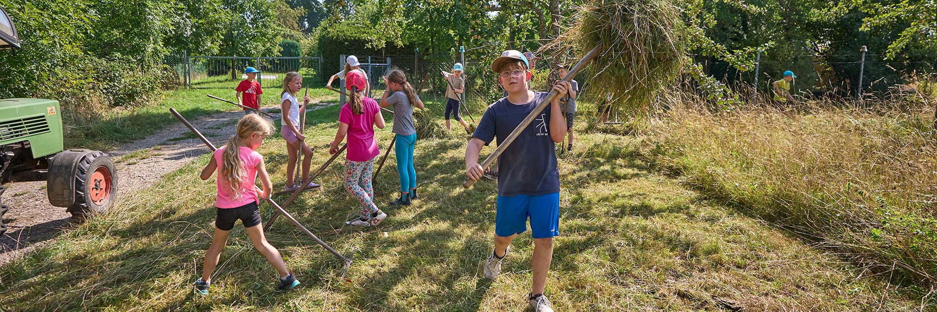 Fabian Lemke hat den Traktor mit Anhänger schon vorgefahren und den Balkenmäher sowie Rechen und Heugabeln aufgeladen. Damit geht es nun zu einer der 21 Wiesen, die der Verein bewirtschaftet. Zuerst wird gemäht. Der Pädagoge demonstriert den Umgang mit dem Balkenmäher und Jan Striepens zögert nicht lange, es selbst auszuprobieren. „Das ist anstrengender, als es aussieht“, lacht er, während er konzentriert die Maschine über die Wiese führt. Anschließend sind die jungen Helferinnen und Helfer mit Feuereifer dabei, das gemähte Gras zusammenzurechen und auf den Anhänger zu laden.