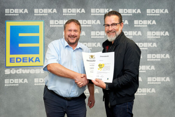 26.09.2025 – Für seine 40-jährige Betriebszugehörigkeit bei EDEKA Südwest wurde jetzt Michael Fuchs aus Ludwigsburg geehrt. Claus Jochums, Personalleiter EDEKA Südwest, gratulierte dem Jubilar und überreichte ihm eine Urkunde sowie ein Präsent als Dankeschön.