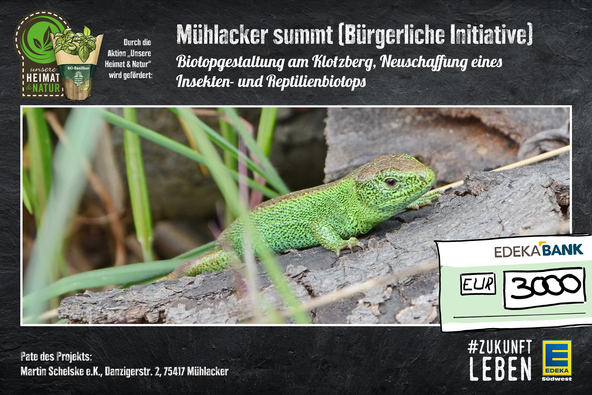 23.09.2020 – Die Initiative „Mühlacker summt“ kümmert sich um die Biotopgestaltung am Klotzberg, die Neuschaffung eines Insekten- und Reptilienbiotops. EDEKA Südwest fördert das Projekt mit einem Preisgeld von 3.000 Euro.