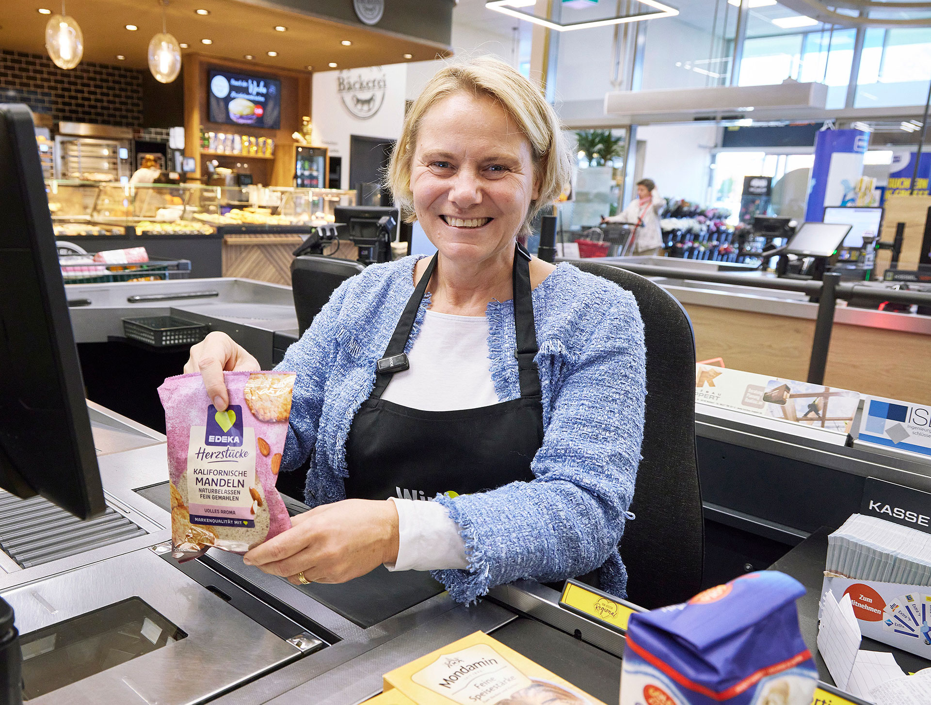 Christiane Staab , MdL, war zu Gast bei EDEKA Kissel SBK und setzte sich für den guten Zweck an die Kasse.